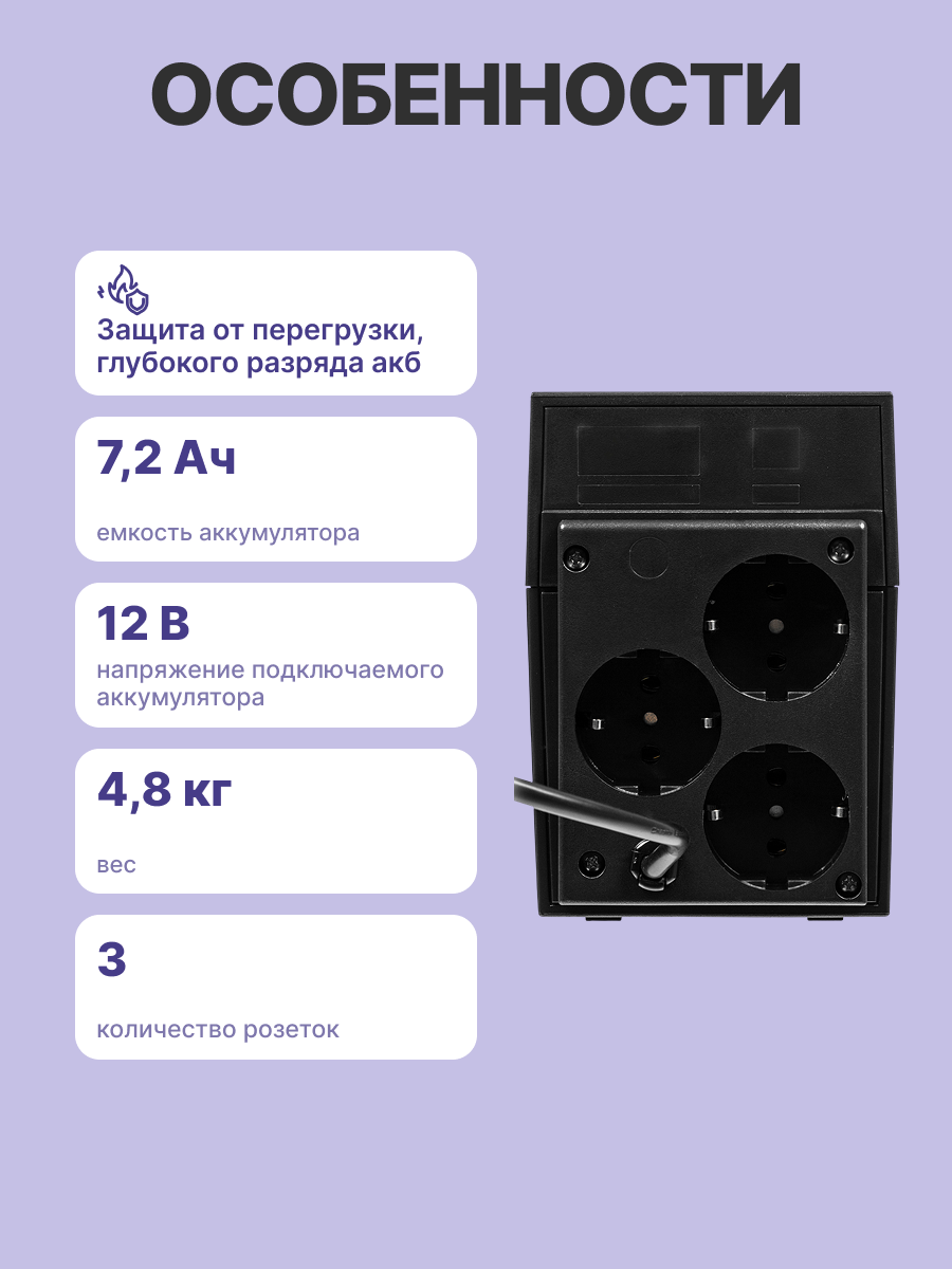 | Особенности | Выходные разъемы: 3 х EURO с резервным питанием; Защита ИБП от перегрузок: Автоматическое отключение ИБП при перегрузке 110% от номинальной мощности в течение 60 секунд и 130% в течение 3 секунд; Тип батареи: Герметичная необслуживаемая свинцово-кислотная. Срок службы 3~5 лет; Напряжение и емкость батареи: 12В 7.2Ач; Время батарейной поддержки (ПК с 17" монитором, нагрузка 100Вт): 13 минут |
