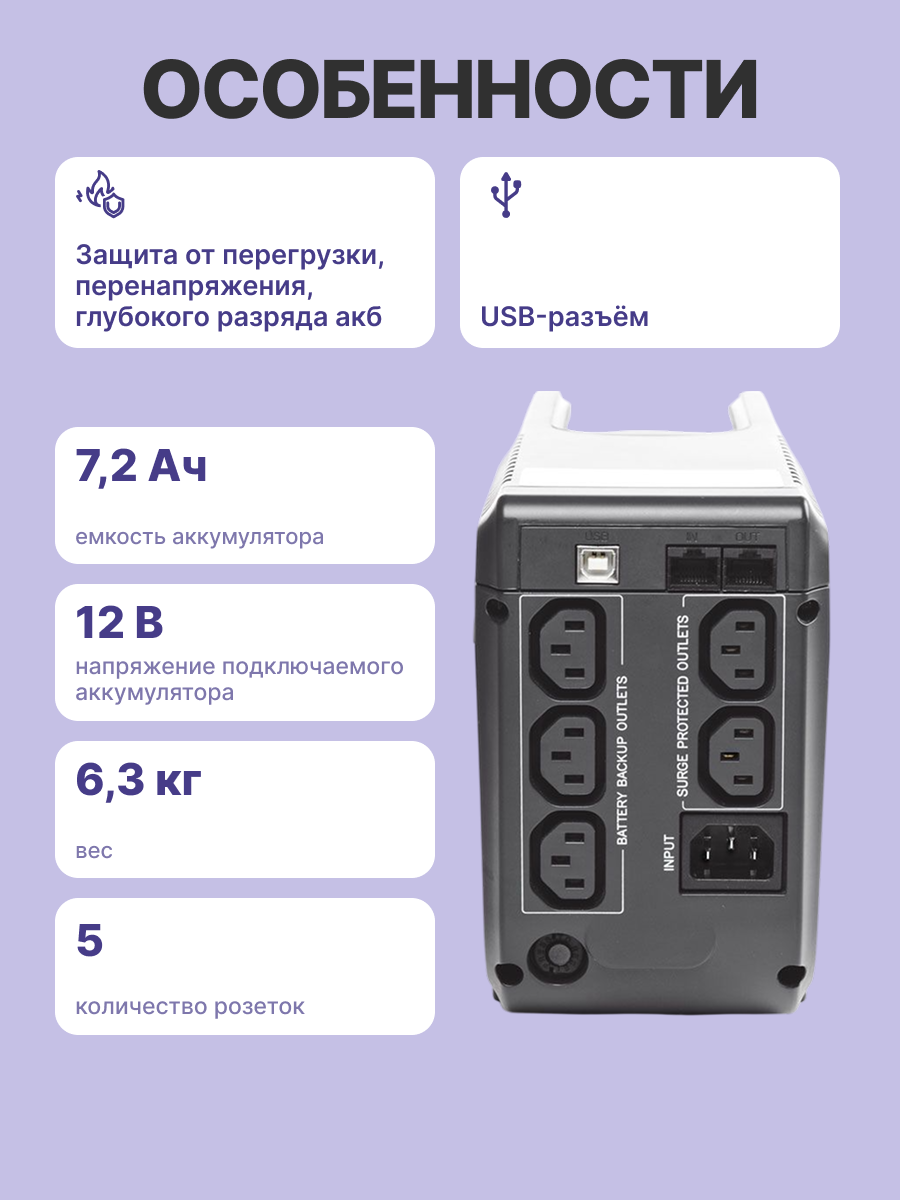 | Особенности | Выходные разъемы: 5хIEC-320 С13: 3 с резервным питанием + 2 с фильтрацией; Защита ИБП от перегрузок: Автоматически выключается, если перегрузка превышает 110% от номинала в течение 60 с или 130% в течение 3 с. При коротком замыкании на выходе - немедленное отключение от нагрузки; Тип батареи: Свинцово-кислотные, герметичные, не требуют обслуживания; Напряжение и емкость батареи: 12В 7.2Ач / 1; Вре |