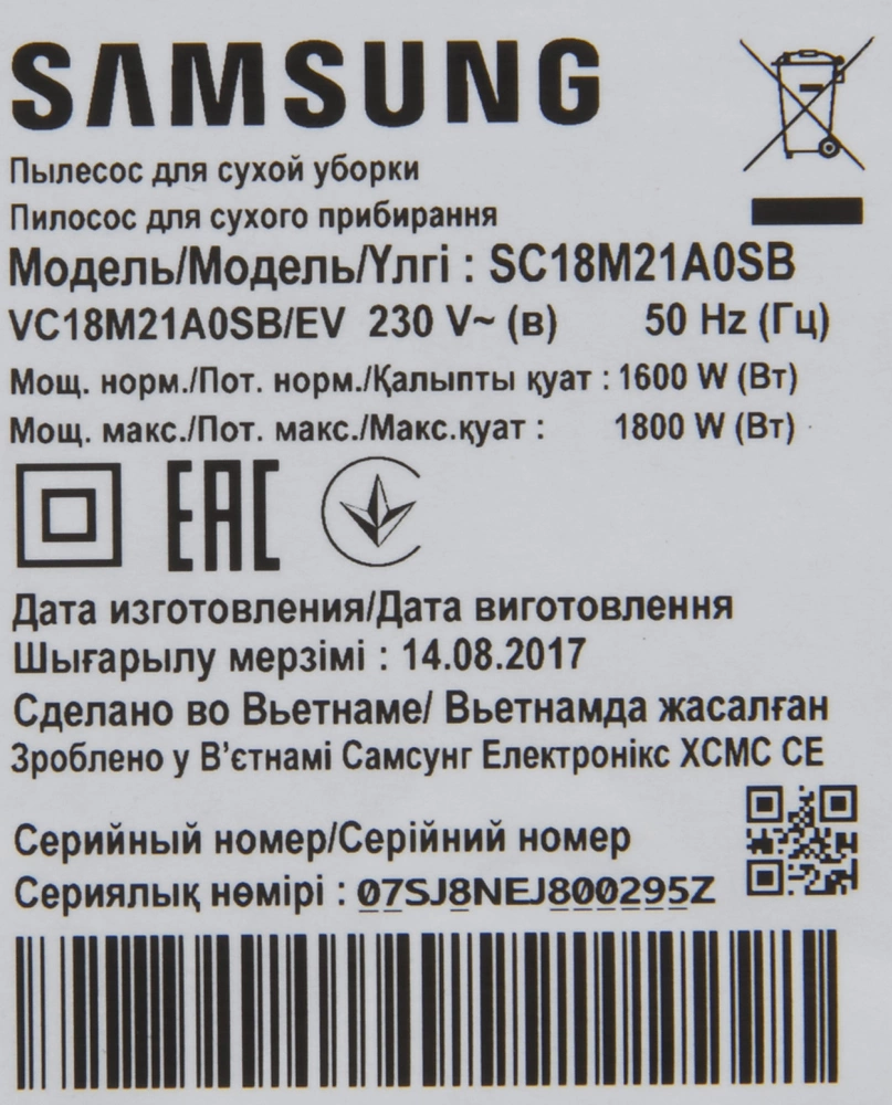| Потребляемая мощность | 1800 Вт |