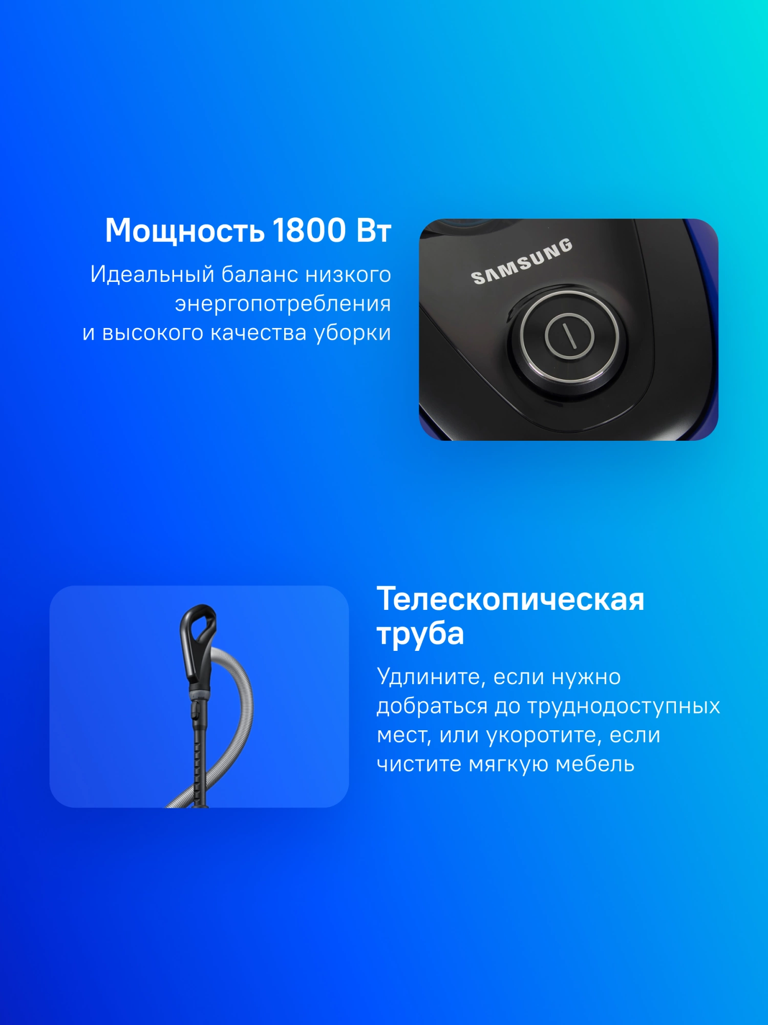 Легкая и удобная конструкция позволяет быстро проводить уборку дома. Размеры пылесоса Samsung VC2100 уменьшены на 22%.