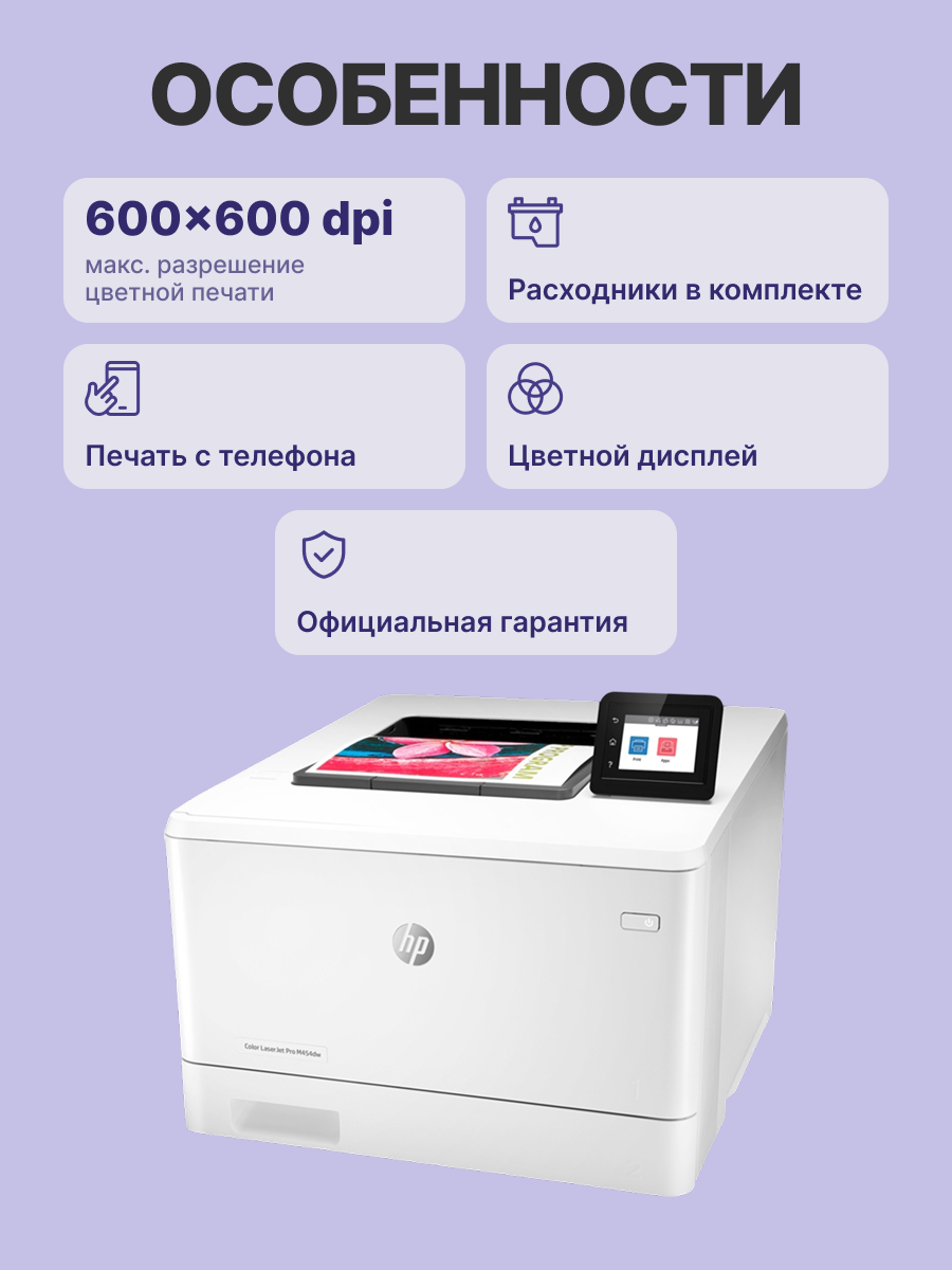 Комплектация | 4 стартовых тонер-картриджа HP LaserJet (черный, голубой, пурпурный, желтый: 1200 страниц); документация в комплекте; листовка с нормативными требованиями; кабель питания; кабель USB; для настройки принтера требуется подключение к Интернету |
