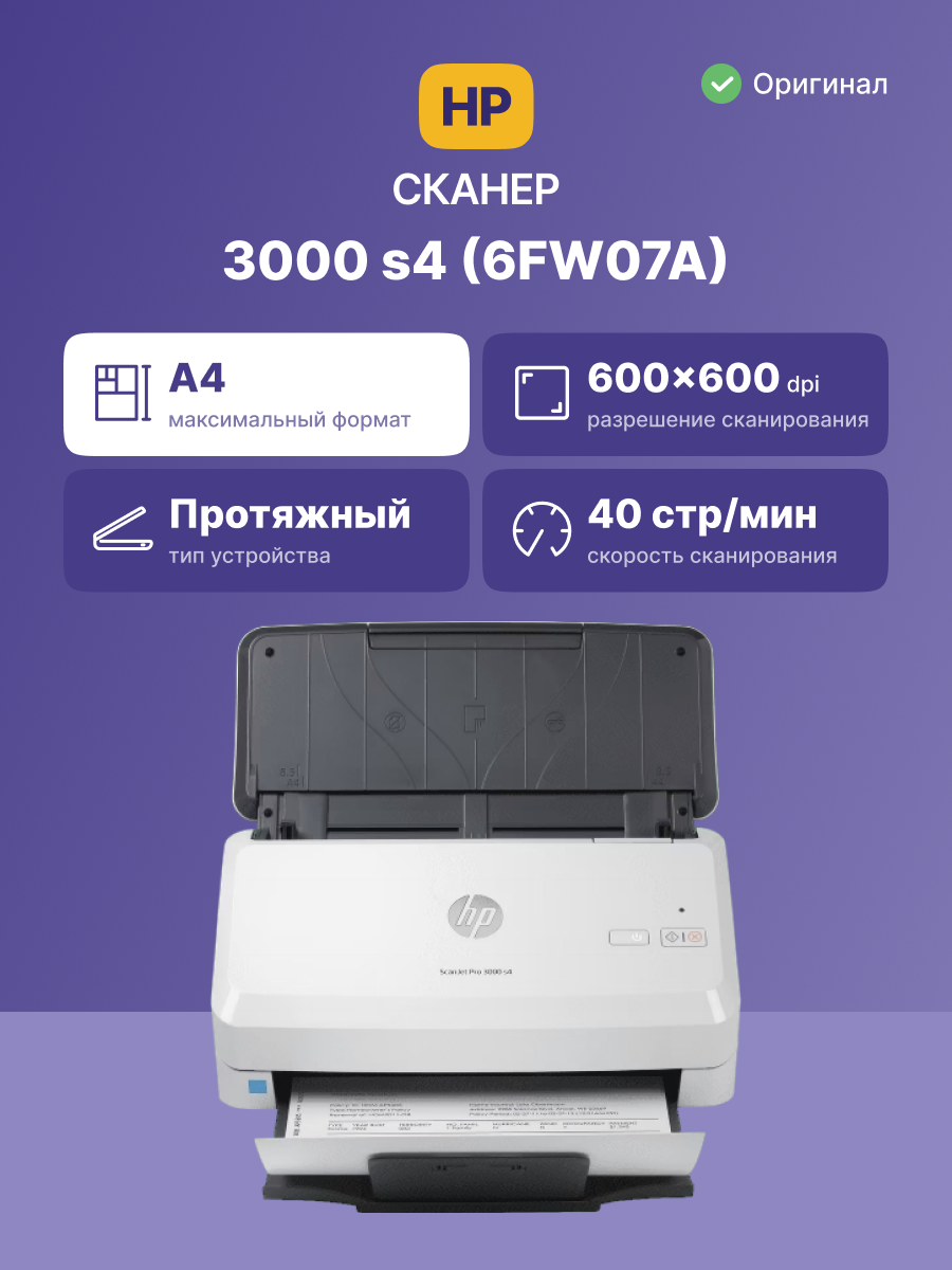 | Комплектация | Сканер HP ScanJet Pro 3000 s4 Sheet-feed Scanner, Кабель питания, Зарядное устройство, USB, Руководство по установке |