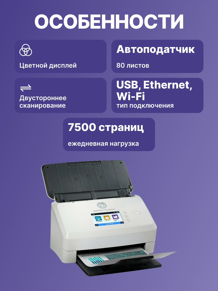 С этим устройством в вашем офисе вы сможете сканировать большие объемы документов и повысить эффективность работы. ПО HP Scan Premium поможет сэкономить время и обеспечит уверенность в высоком качестве результатов. Сканируйте со скоростью до 75 страниц или 150 изображений в минуту. Рекомендуемая нагрузка — до 7500 страниц в день.