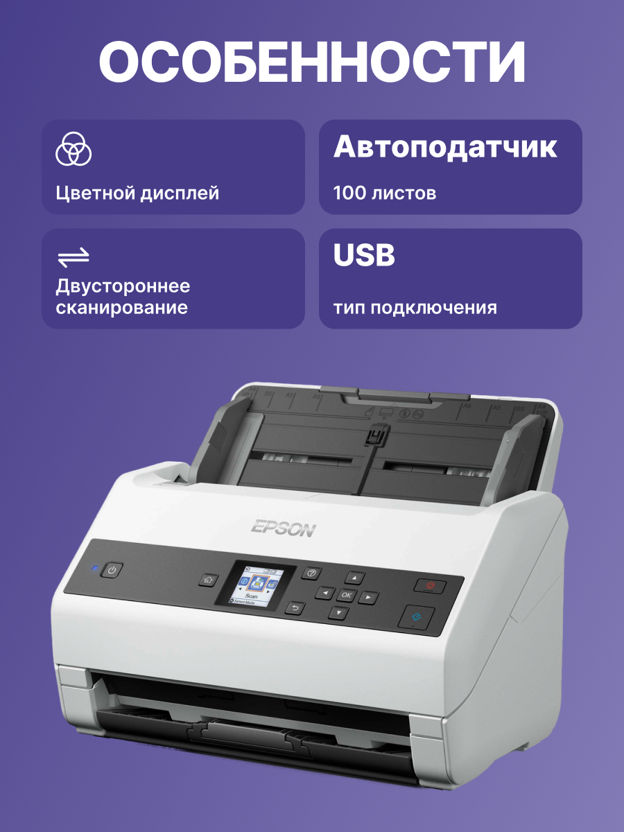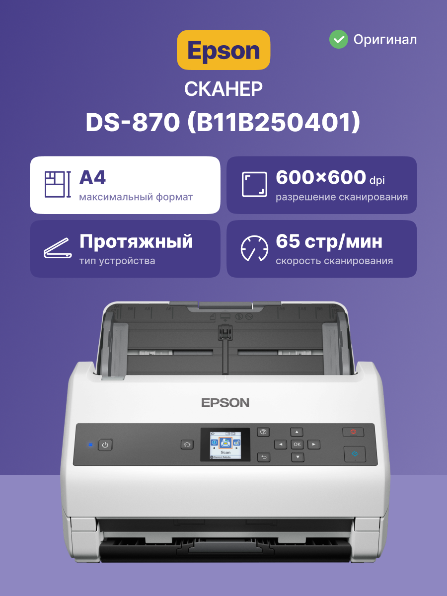 Сканер Epson WorkForce DS-870 (A4, 600x600 dpi, 24 бит, 65 стр/мин, двусторонний, USB)