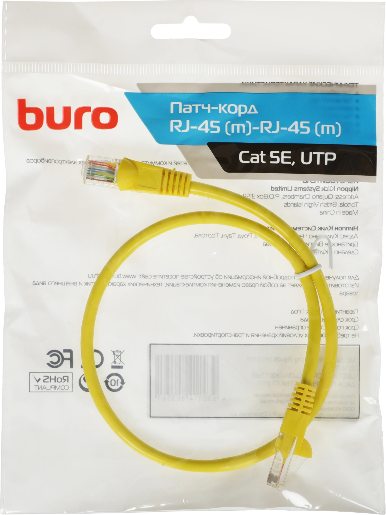 Патч-корд Buro 1427773 (RJ-45 (m), RJ-45 (m), алюминий омедненный, 0,5м, 4пары, UTP)
