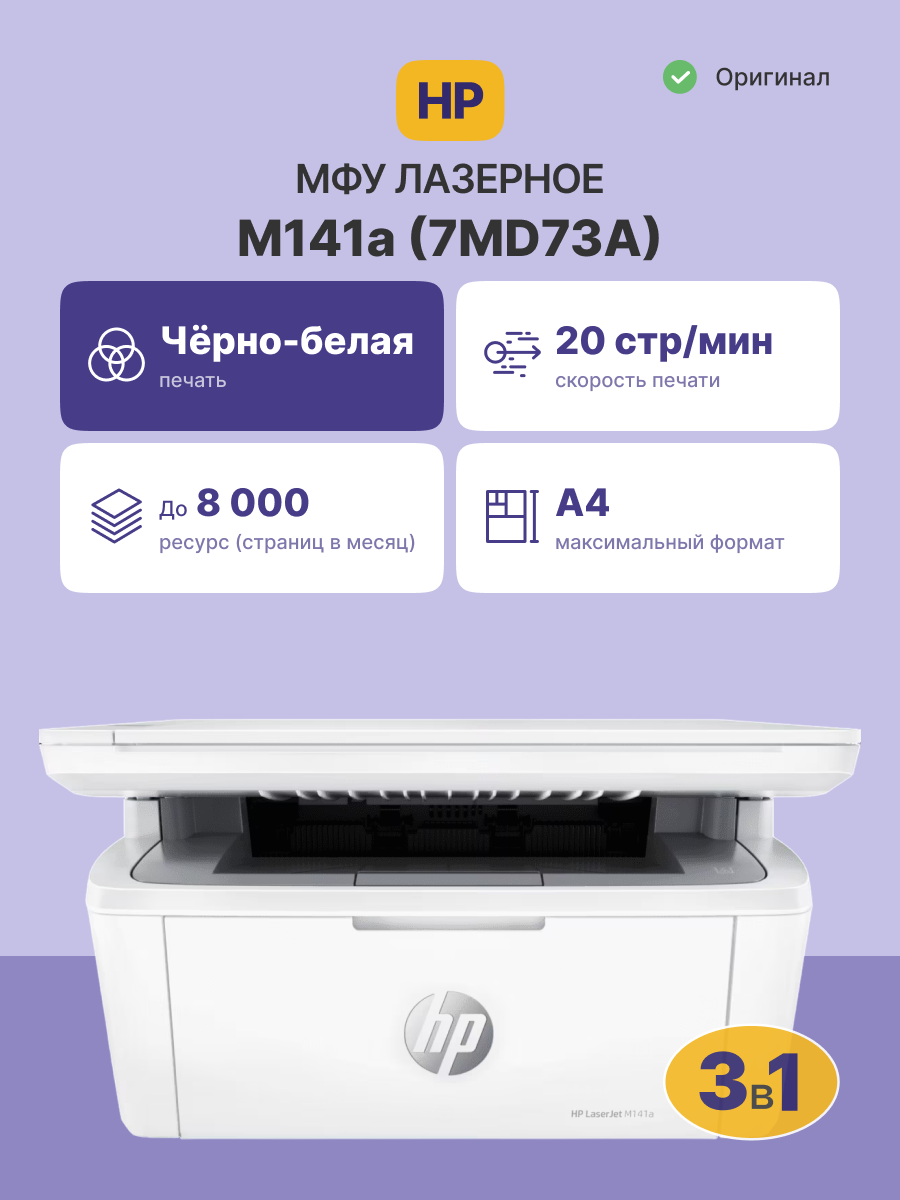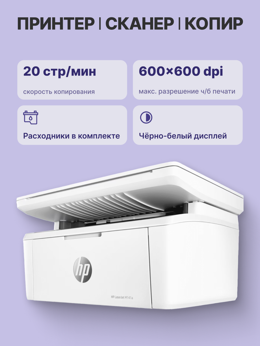 Комплектация | МФУ HP LaserJet M141a, кабель питания, картридж HP LaserJet с черным тонером (ресурс: 500 страниц), плакат с инструкциями по настройке, справочное руководство, руководство по гарантии, рекламная листовка. |