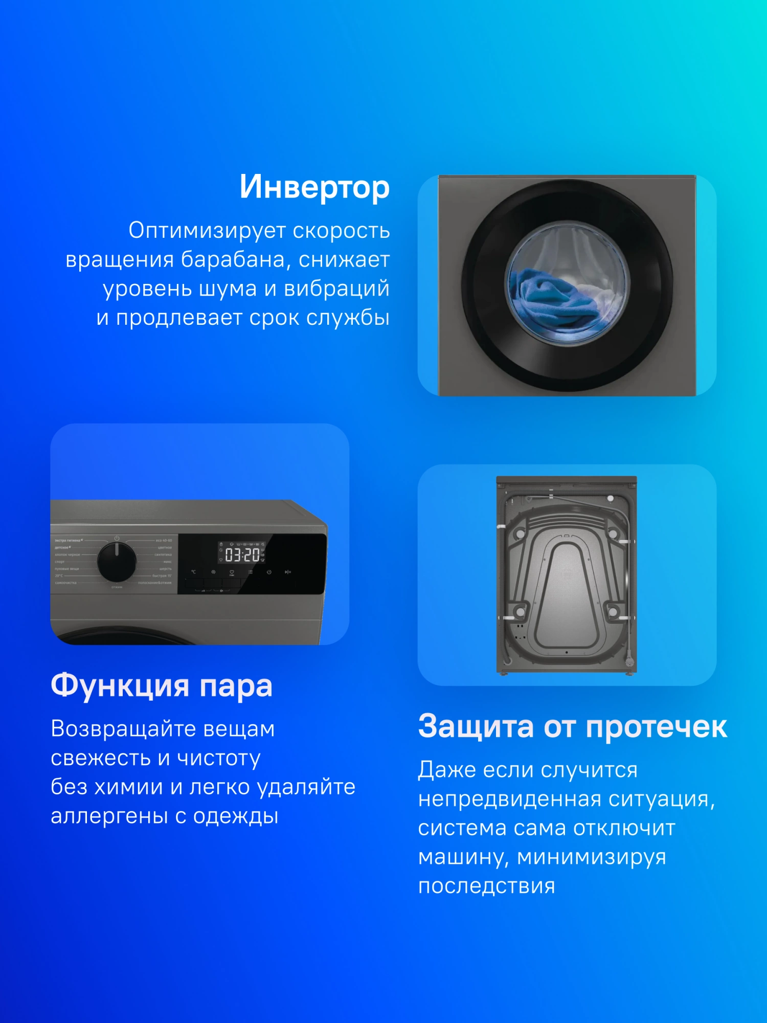Мощный инверторный мотор работает без щеток, поэтому отсутствуют механические воздействия, трение и износ. Это улучшает результаты стирки, повышает энергоэффективность, обеспечивает тихую работу и продлевает срок службы мотора и самой машины. Этот очень мощный мотор устанавливается на наших лучших моделях.