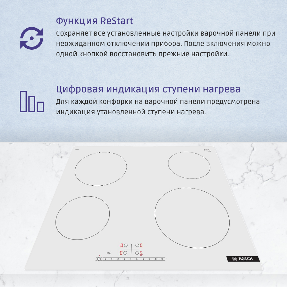 С помощью функции reStart варочная поверхность сохраняет все настройки в случае непреднамеренного выключения. Для этого, если случайно отключили прибор главным выключателем, необходимо в течение 4 секунд снова включить варочную панель главным выключателем и тогда все предыдущие настройки восстановятся