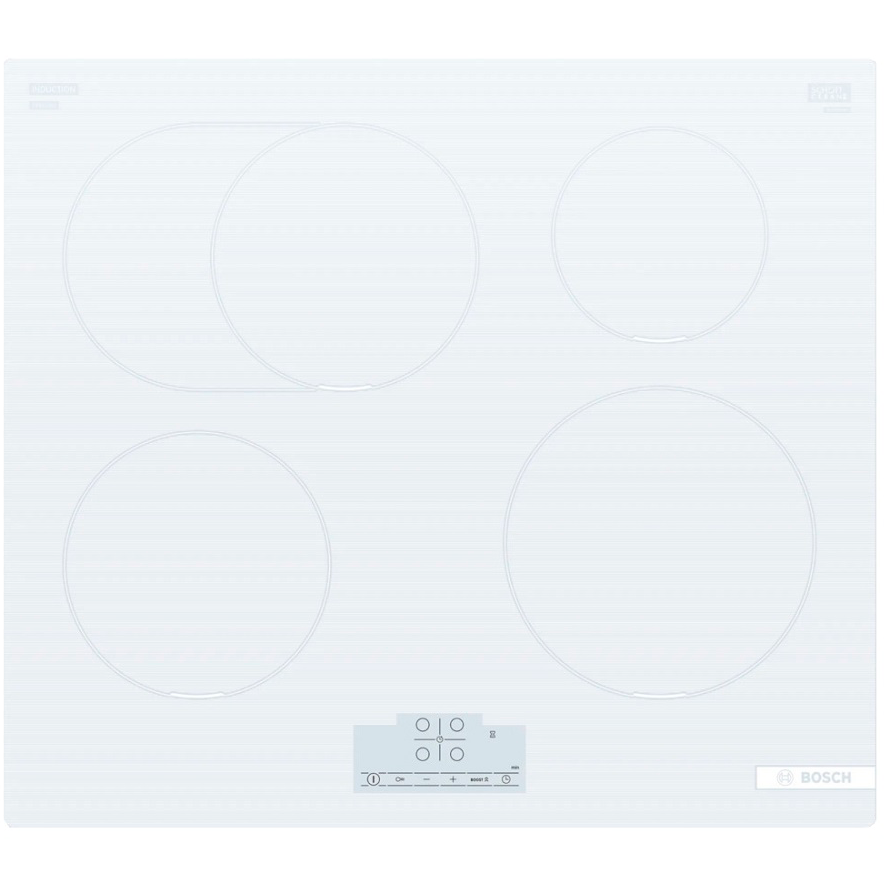 Корпус варочной панели Bosch PIF612BB1E выполнен из стеклокерамики белого цвета. Материал отличается высокой устойчивостью к различным повреждениям: на поверхности не появляются сколы, царапины и потертости, она легко очищается от загрязнений. Плита обладает скошенными краями.