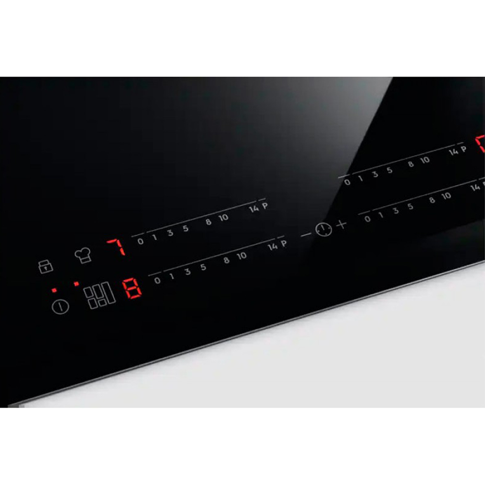 Панель управления сенсорная, с четырьмя слайдерами — по одному для каждой конфорки. Чтобы выбрать уровень мощности, нужно лишь провести пальцем до нужной отметки. Продолжительность приготовления можно установить, запрограммировав таймер. По истечении заданного времени панель автоматически выключится и оповестит Вас звуковым сигналом. Поддерживается функция «Эко»: приготовление на остаточном тепле, что позволяет экономить электроэнергию. Доступ к настройкам можно заблокировать — случайное нажатие не приведет к изменению параметров.