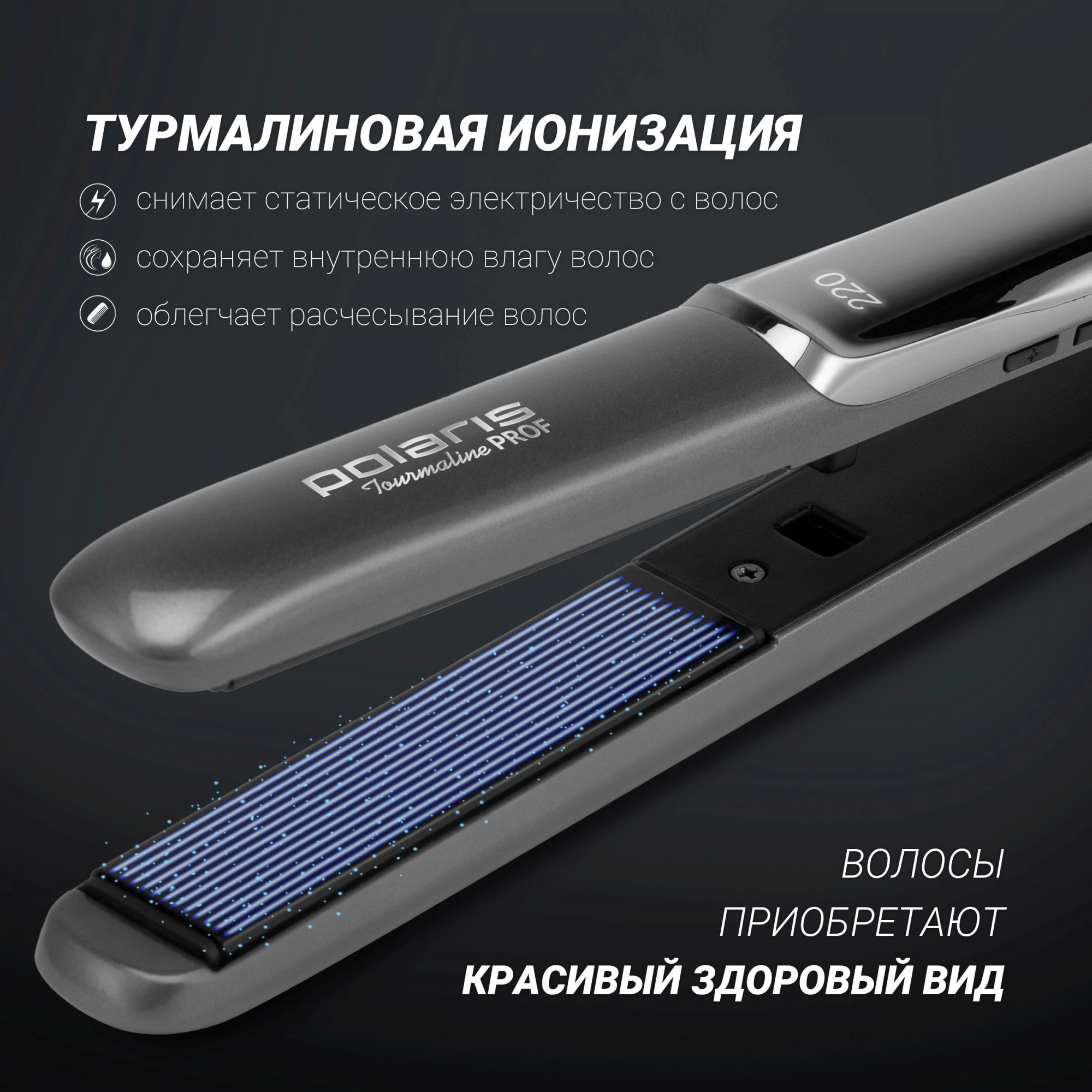 2 В 1: выпрямление и подкручивание волос. Турмалиновое покрытие генерирует ионы кислорода, которые благотворно воздействуют на волосы, снимают статическое напряжение, делая их послушными, здоровыми и естественно блестящими. 5-ступенчатая регулировка температуры: 140-220° C.