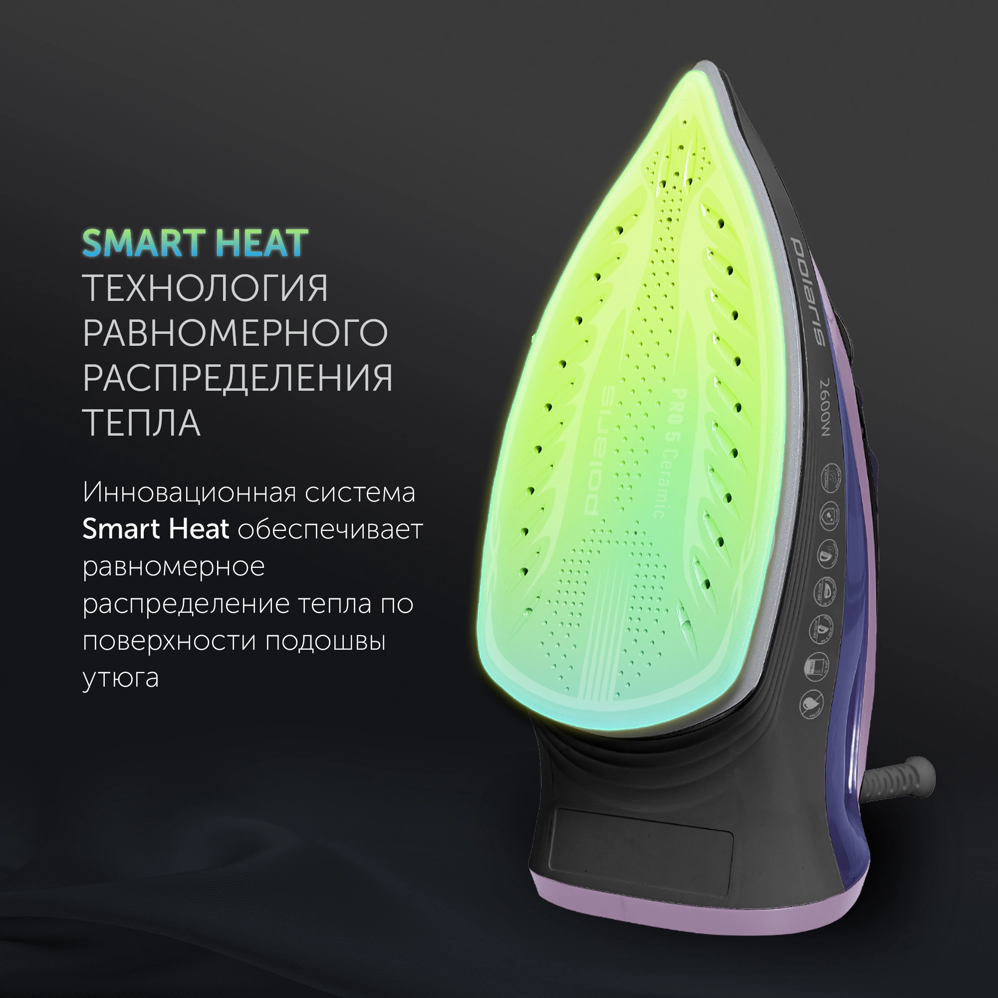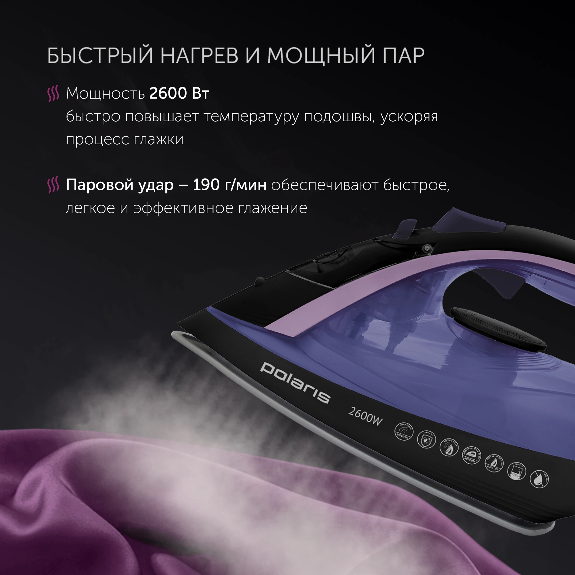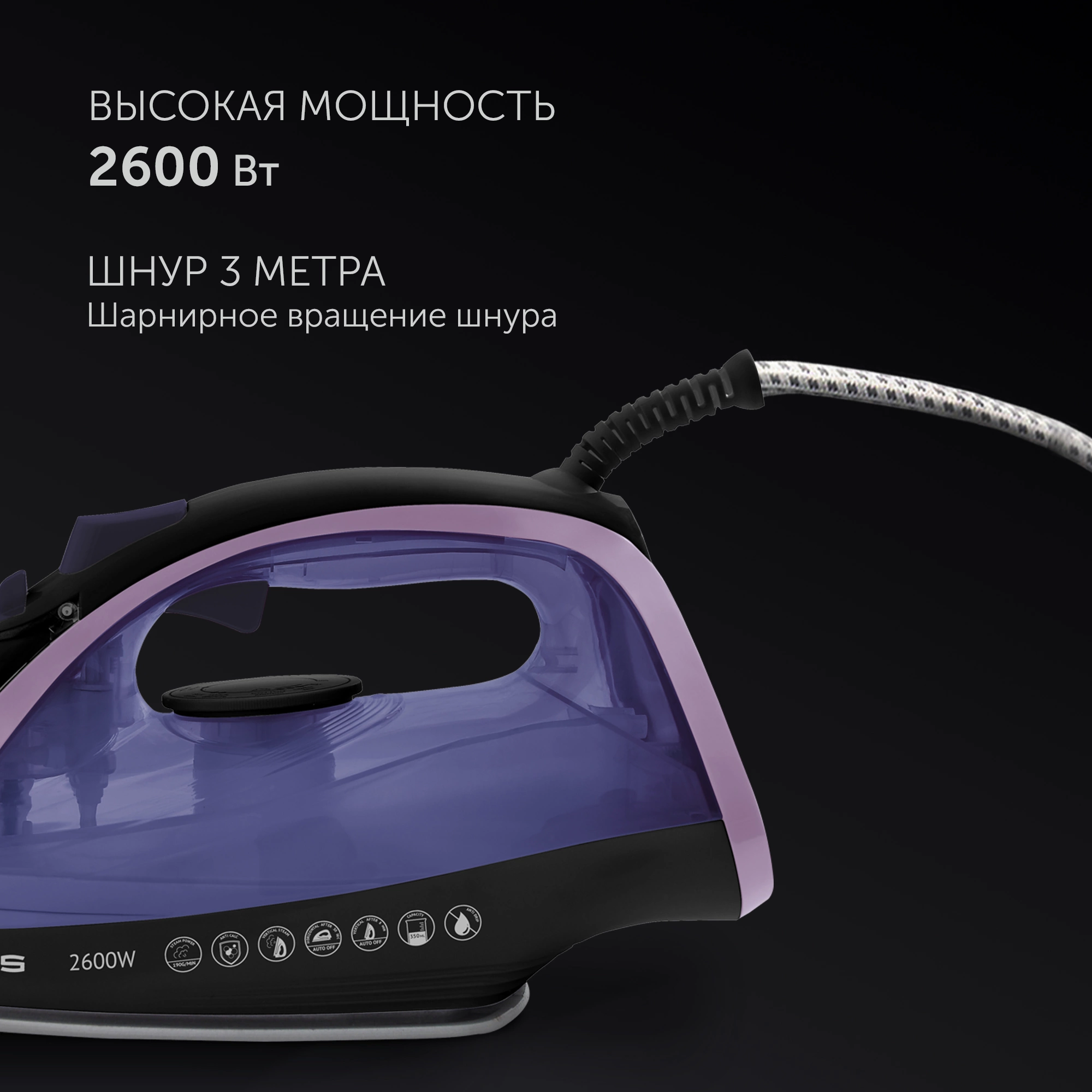 Регулировка подачи пара. Регулировка температуры. Индикатор нагрева утюга.Режимы работы: сухое глажение, постоянная подача пара (50 г/мин), интенсивная подача пара (190 г/мин), вертикальное отпаривание. Автоматическое отключение: 8 минут - вертикально, 30 секунд - горизонтально.