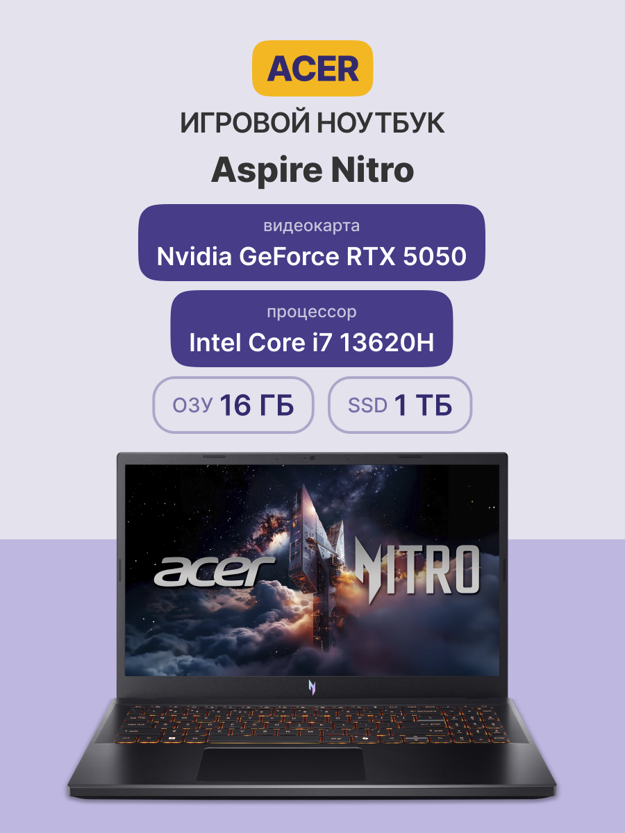 Acer Nitro V 15 — это сочетание игровой мощности и портативности. Это устройство, оснащенное процессором Intel Core и видеокартой GeForce RTX 50 серии, прекрасно подходит для работы в режиме многозадачности и динамичных игр.