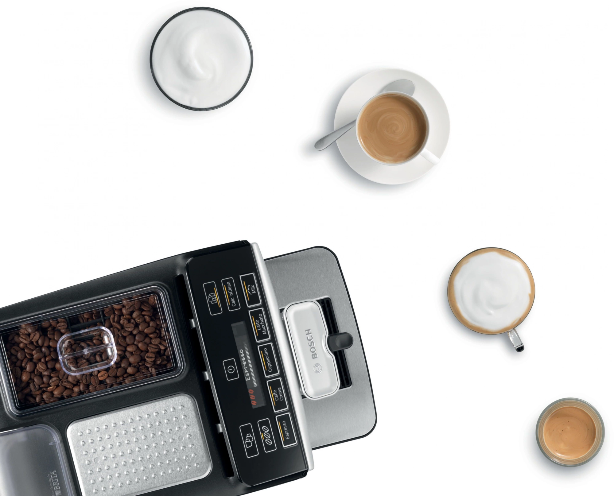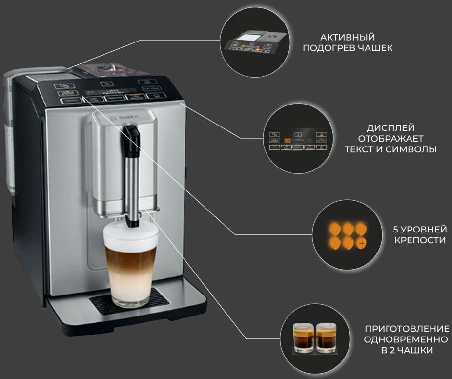 Кофемашина Bosch TIS30321RW. Бодрящий эспрессо, крепкий ристретто, мягкий капучино или воздушный латте макиато — с Bosch VeroCup 300 TIS30321RW так легко баловать себя вкусными напитками каждый день. А если в гости пришла подруга, ставьте вторую чашку, ведь прибор может делать две порции одновременно. Контейнер для зерен вмещает 250 граммов, объем резервуара 1.4 литра. За счёт функции самоочистки устройство автоматически устраняет накипь, остатки молока и другие загрязнения. Предусмотрен здесь и режим энергосбережения, который активируется, когда вы долго не подходите к машине. Опция OneTouch Function делает процесс заваривания проще: вы получаете долгожданный напиток всего одним нажатием кнопки. Останется только добавить нежную молочную пенку, которую легко взбить прямо в кружке. Предварительное смачивание молотых и прессованных зёрен в полной мере раскроет вкус и аромат кофе.