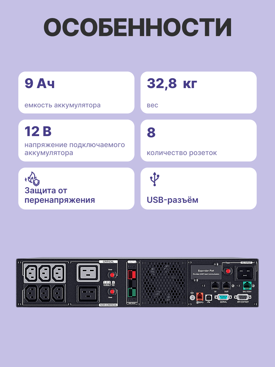 | Особенности | Линейно-интерактивная топология ИБП Технология энергосбережения Совместим с активными PFC Выходной сигнал напряжения в виде чистой синусоиды Night Mode Design Tool-less Battery Replacement Battery Management Technology High Output Power Factor Встроенный стабилизатор напряжения Перегрузочная способность Критические/некри |