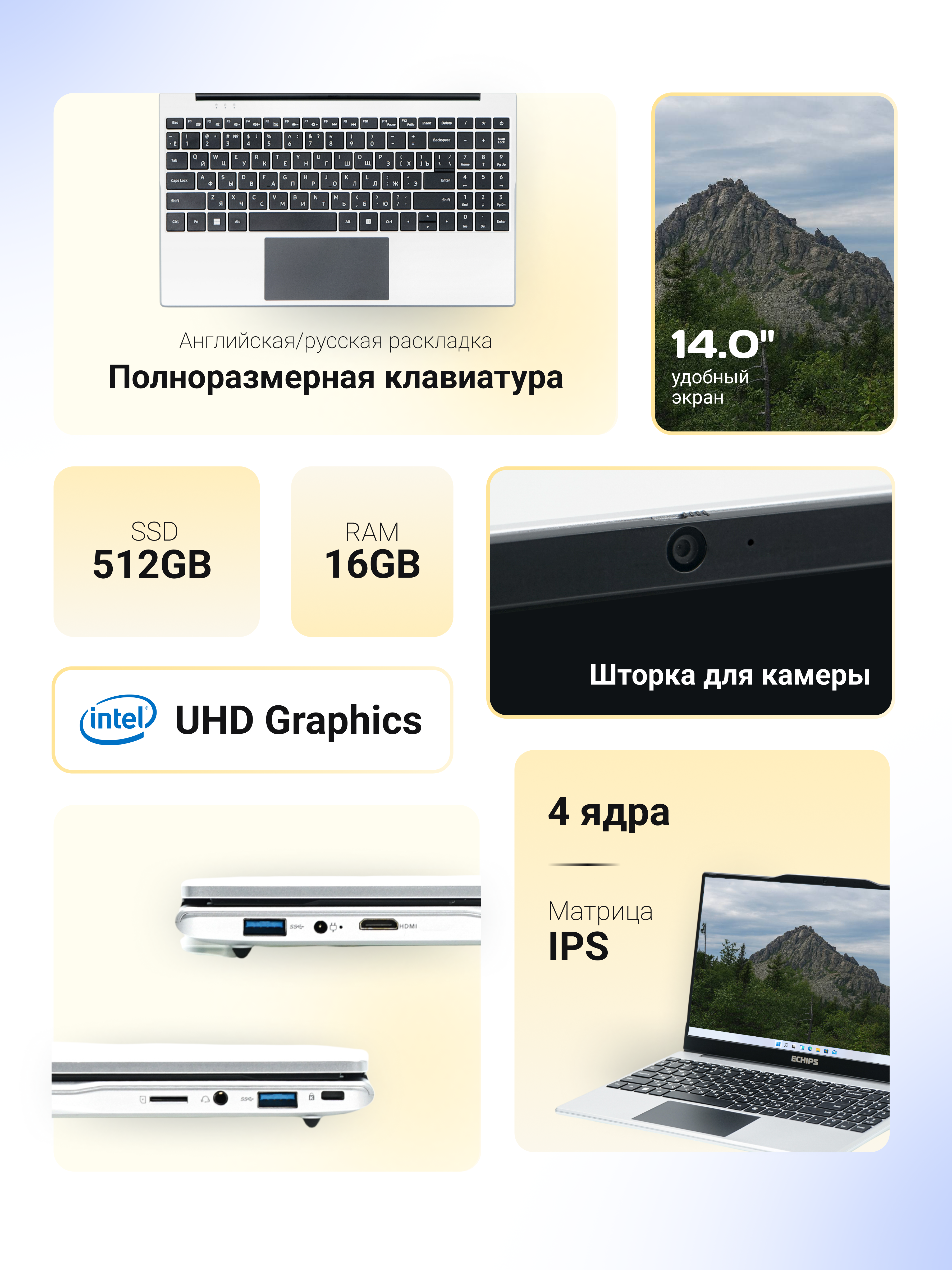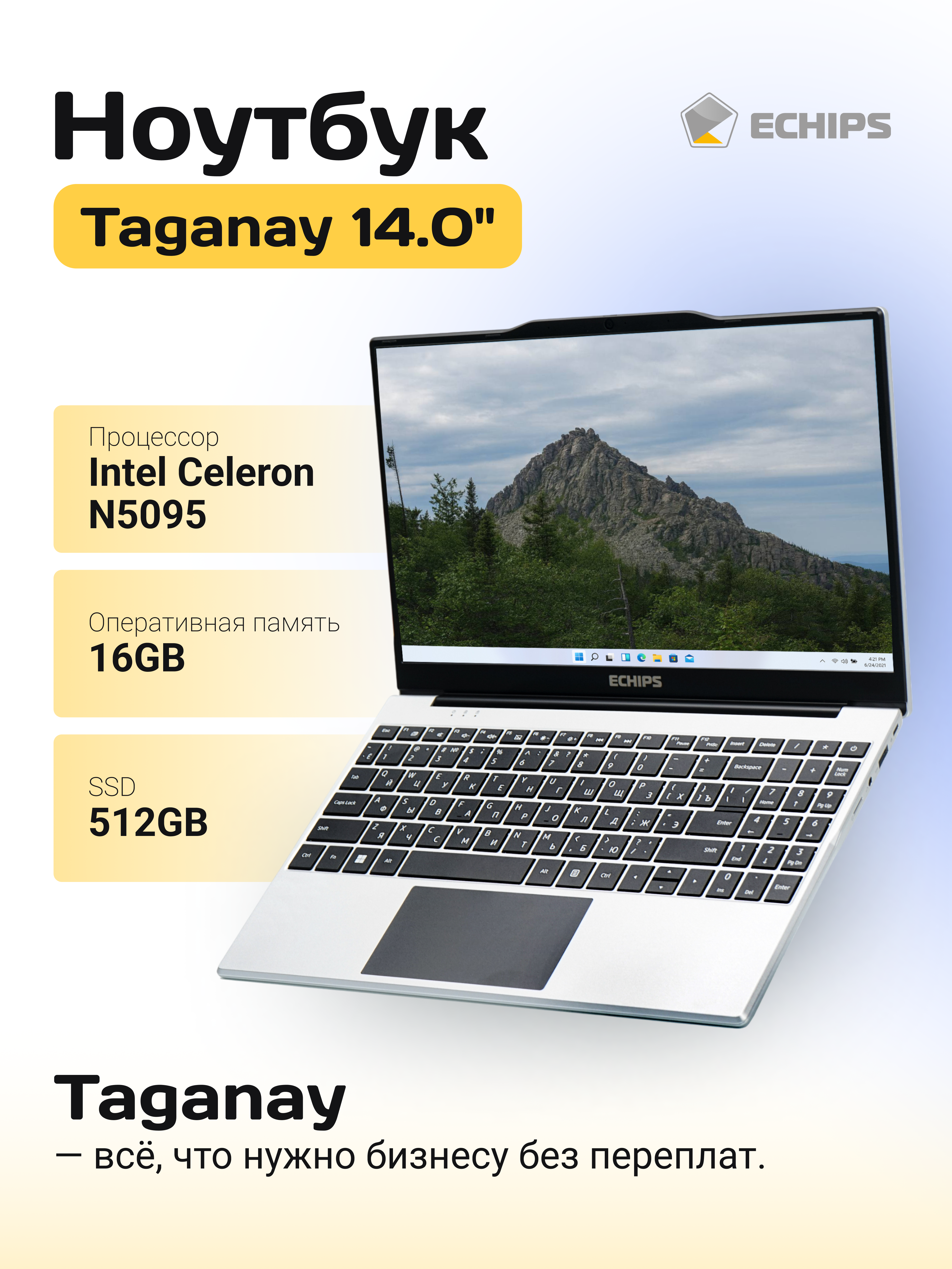 Echips Taganay (Intel Celeron N5095 2 ГГц/16 ГБ DDR4/14" IPS 1920x1080/512ГБ SSD/Intel UHD Graphics Gen11/Windows 11 Home)