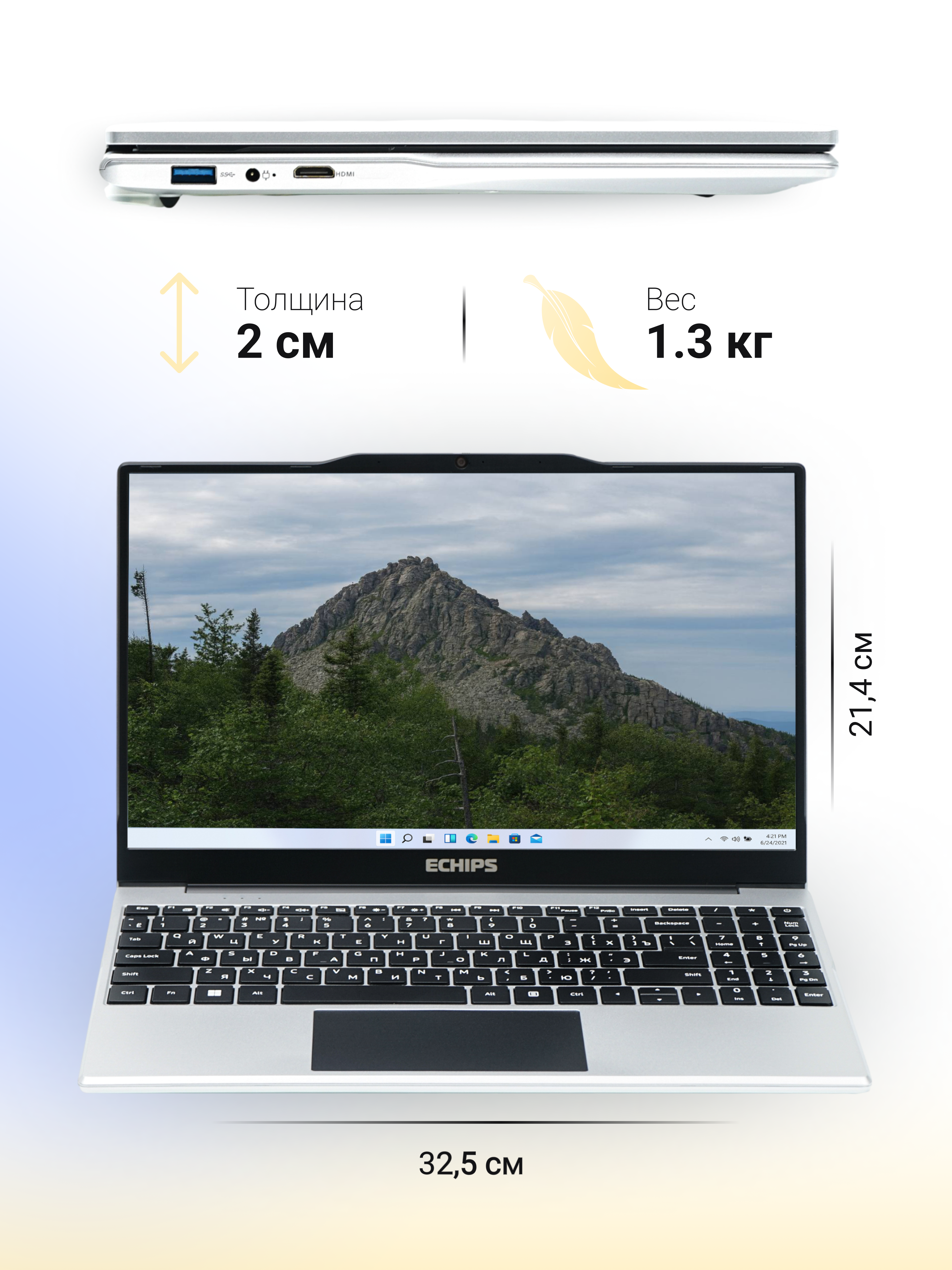 Ноутбук выполнен в серебристом корпусе и весит всего 1.3 кг, что делает его очень портативным и удобным для переноски. Компактные размеры и легкий вес позволяют легко брать его с собой в поездки или на работу.