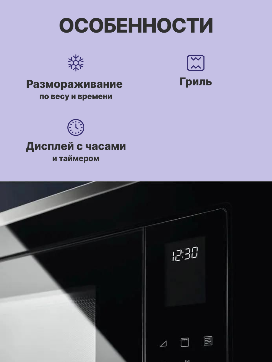 Микроволновая печь оснащена мощностью микроволн 900 Вт и грилем мощностью 1000 Вт, что позволяет быстро разогревать, готовить и запекать продукты. Быстрый нагрев обеспечивает мгновенное начало процесса, а высокая мощность гарантирует равномерное приготовление без горячих точек. Гриль позволяет достигать аппетитной корочки и хрустящей текстуры, делая блюда более вкусными и привлекательными.