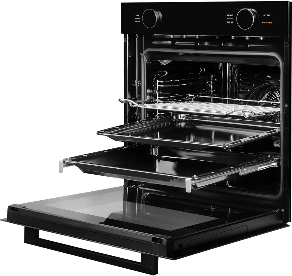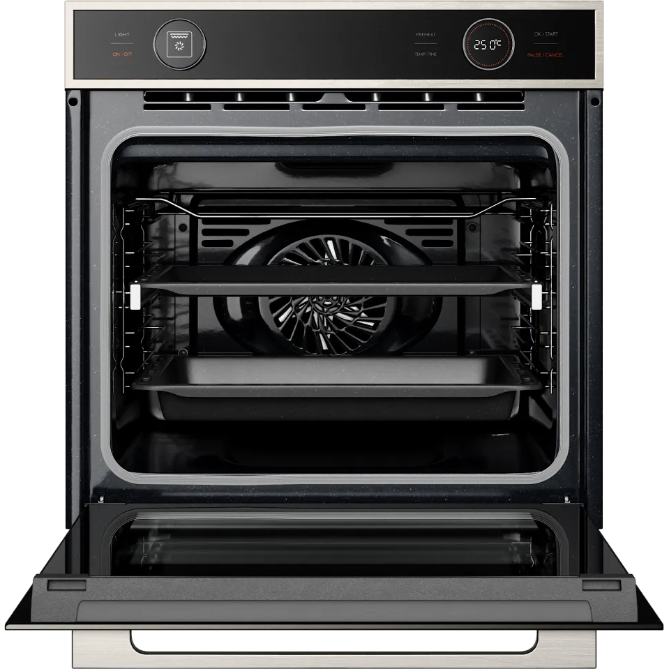 Модель оснащена тремя слоями закаленного стекла в дверце, что обеспечивает отличную теплоизоляцию и безопасность — случайное касание к дверце не приведет к ожогу. Съемная дверца и внутреннее стекло значительно упрощают процесс очистки. Телескопические хромированные направляющие на одном уровне позволяют легко загружать и извлекать противни, не придерживая их, а система плавного доводчика двери предотвращает хлопки.