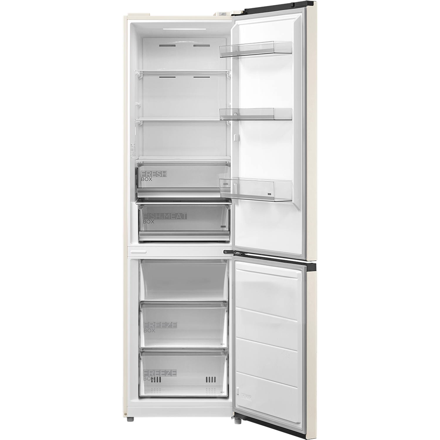 Полезный объем холодильника составляет 386 л, из которых 263 л отведено под холодильную камеру, а 123 л — под морозильник, расположенный внизу. Внутреннее пространство верхнего отсека организовано с максимальным удобством: прочные полки из закаленного стекла легко выдвигаются, а наличие специальной зоны свежести подходит для длительного хранения овощей, фруктов и зелени. Морозильная камера оборудована тремя вместительными ящиками, а на дверце холодильного отделения найдется место для бутылок и небольших продуктов.