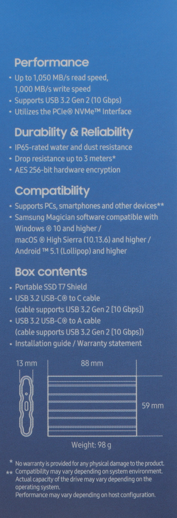 Очень прочный, быстрый и компактный. Новый T7 Shield обеспечивает отличную производительность даже в сложных условиях. Отличная производительность и прочный внешний корпус обеспечивают удобство использования как на встречах с клиентами, так и дома и в любом другом месте. Передавайте большие файлы без задержек. USB 3.2 Gen 2 и PCIe NVMe обеспечивают высокую скорость последовательного чтения/записи 1050/1000 МБ/с для редактирования без задержек прямо с диска. Наружные поверхности из высокотехнологичной резины и Dynamic Thermal Guard регулируют температуру и поддерживают стабильную работу даже во время крупных проектов. Готов к сложным условиям. Вы можете быть уверены, что ваши данные защищены от воды и пыли согласно рейтингу IP65. Прочная конструкция и усовершенствованная внешняя оболочка гарантируют долговечность и выдерживают падение с высоты до трех метров. Вы можете выбрать нужный вариант. Не менее 1 ТБ или 2 ТБ места в стильных корпусах синего, песочного или черного цвета. Стильная резиновая поверхность предотвращает выскальзывание устройства из рук.