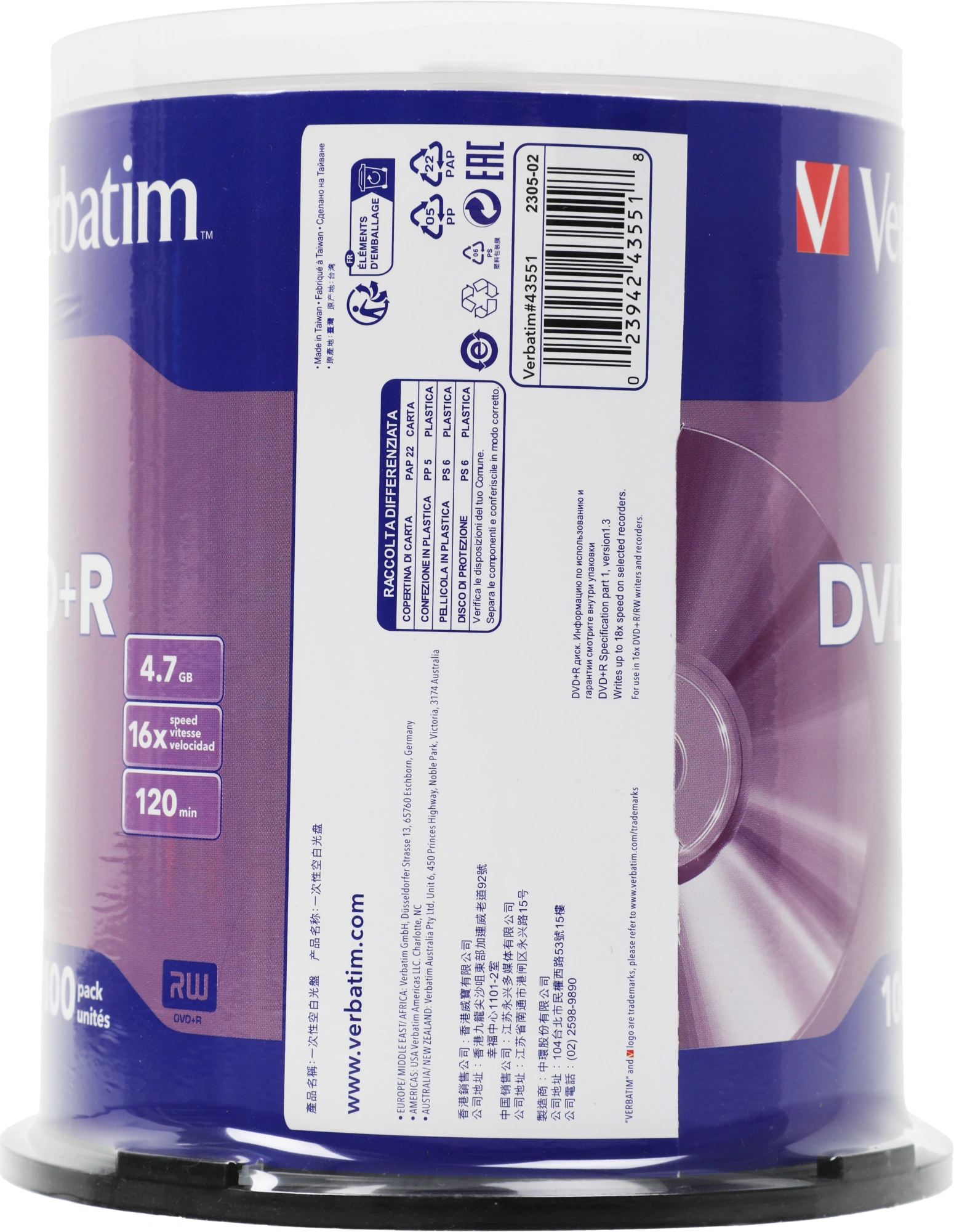 Диск DVD+R Verbatim (4.7Гб, 16x, cake box, 100)